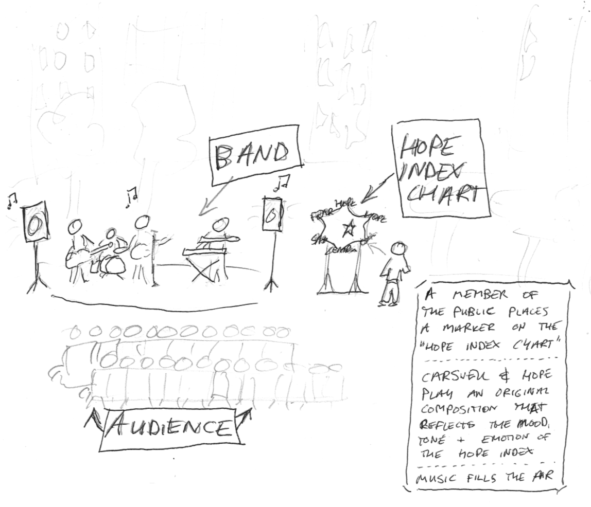 The concept: members of the public will be invited to listen and to chart the music of Carswell & Hope on a unique art matrix, dubbed the “Hope Index”, while the band performs original works.