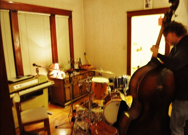 Recording for our debut EP has been great so far. Fun, relaxed and sound pretty amazing. So many times in the studio, the pressure of the end product is the focus, but this time, we are allowing ourselves comfortable surroundings (as you can see) and coming up with great recordings and great performances. This picture is of a recent session at home with all the wood of Nick’s house resonating beautifully with Dan’s upright bass. Cups of tea were had, many takes recorded . . . this little record is well on its way.